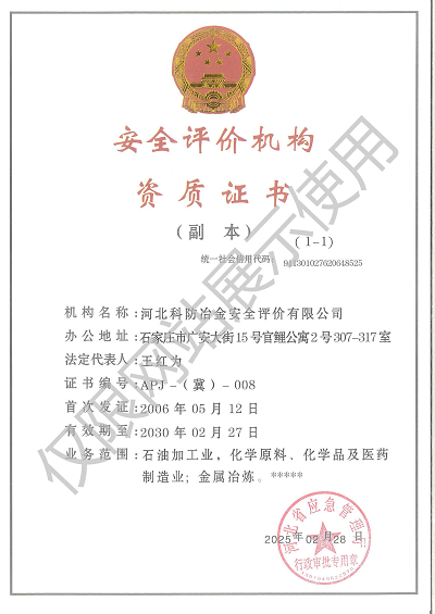 河北科防冶金安全評價(jià)有限公司成立于2004年5月,注冊資本2000萬元,是專業(yè)從事安全評價(jià)、安全生產(chǎn)標(biāo)準(zhǔn)化咨詢、安全生產(chǎn)標(biāo)準(zhǔn)評審、職業(yè)病危害因素檢測和評價(jià)、安全生產(chǎn)隱患排查、應(yīng)急管理咨詢及預(yù)案編制等安全生產(chǎn)綜合技術(shù)服務(wù)公司?,F(xiàn)有專家、專業(yè)技術(shù)人員110人,專業(yè)覆蓋安全、化工工藝、化工機(jī)械、自動(dòng)化、電氣、機(jī)械、冶金、有色金屬等。