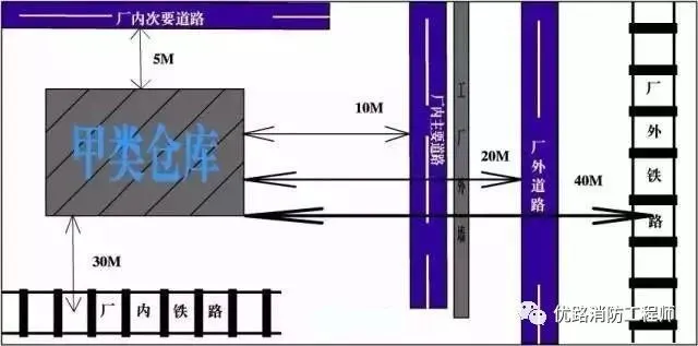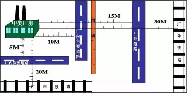 散發(fā)可燃氣體、可燃蒸氣的甲類廠房與廠外鐵路中心線、廠內鐵路中心線、廠外道路路邊、廠內主要道路路邊和廠內次要道路路邊的防火間距不應小于30、20、15、10和5米。《建筑設計防火規(guī)范》(GB50016-2014)3.4.3