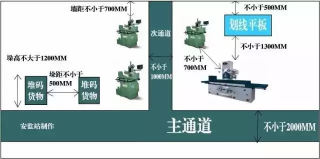 車間橫向主要通道根據需要設置 其寬度不應小于2000 mm!督饘偾邢骷庸ぐ踩蟆罚↗B 7741 1995)4.6.3 機床之間的次要通道寬度一般不應小于 1000 mm。《金屬切削加工安全要求》(JB 7741 1995)4.6.4