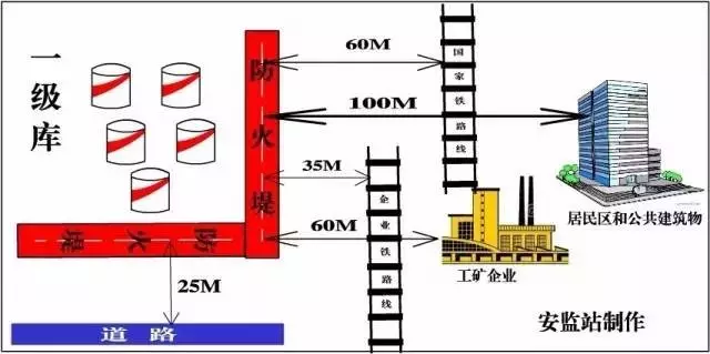 甲B、乙類液體:地上罐組;甲B、乙類覆土立式油罐;無油氣回收設施的甲B、乙A類液體裝卸碼頭(一級庫):距離居民區(qū)和公共建筑物100米,距離工礦企業(yè)60米,距離國家鐵路線60米,距離工業(yè)企業(yè)鐵路線35米,距離道路25米。