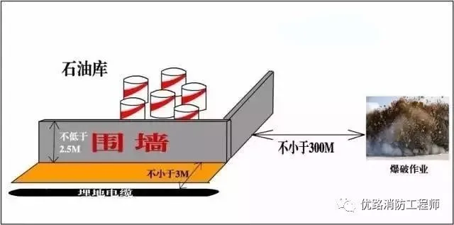 油庫的圍墻與爆破作業(yè)場地(如采石場)的安全距離,不應小于300m!妒蛶煸O計規(guī)范》(GB50074-2014)4.0.12