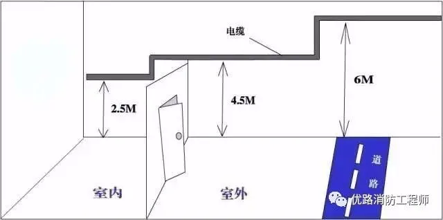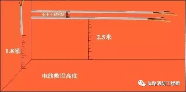 護套導線距離地面最小距離,水平敷設:室內2.5米;垂直敷設:室內1.8米!兜蛪号潆娫O計規(guī)范》(GB50054-2011)7.2.1
