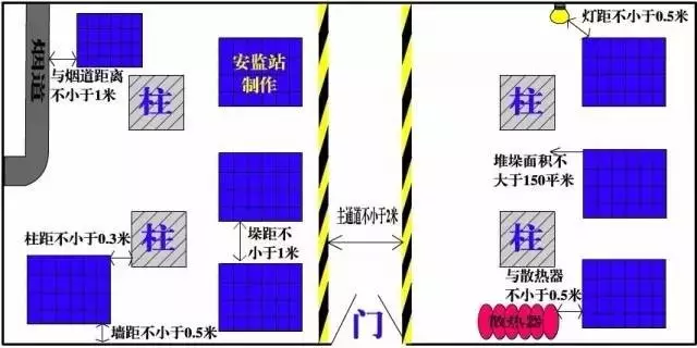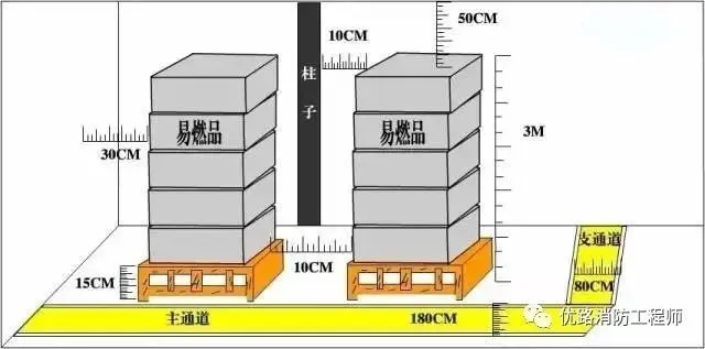 堆垛間距:主通道大于或等于180CM,支通道大于或等于80CM,墻距大于或等于30CM,柱距大于或等于10CM,垛距大于或等于10CM,頂大于或等于50CM!兑兹家妆陨唐穬Υ骛B(yǎng)護技術條件》(GB17914-2013)6.2