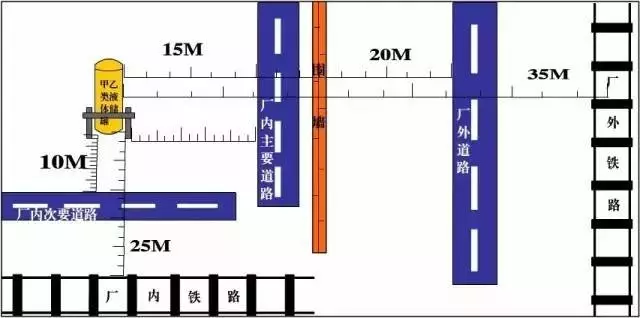 甲、乙類液體儲罐與廠外鐵路中心線、廠內鐵路中心線、廠外道路路邊、廠內主要道路路邊和廠內次要道路路邊的防火間距不應小于35、25、20、15和10米!督ㄖO計防火規(guī)范》(GB50016-2014)4.2.9