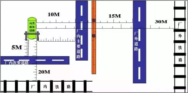 丙類液體儲罐與廠外鐵路中心線、廠內鐵路中心線、廠外道路路邊、廠內主要道路路邊和廠內次要道路路邊的防火間距不應小于30、20、15、10和5米!督ㄖO計防火規(guī)范》(GB50016-2014)4.2.9