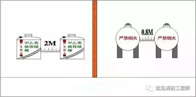 甲乙丙類液體儲罐成組布置時,組內儲罐的布置不應超過兩排,甲乙類液體立式儲罐之間的防火間距不應小于2M,臥式儲罐之間的防火間距不應小于0.8M!督ㄖO計防火規(guī)范》(GB50016-2014)4.2.3