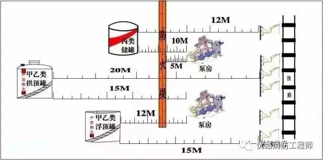 甲乙拱頂罐與其泵房、鐵路及裝卸鶴管的防火間距為15米和20米;甲乙浮頂罐與其泵房、鐵路及裝卸鶴管的防火間距為12米和15米;丙類液體儲罐與其泵房、鐵路及裝卸鶴管的防火間距為10米和12米。泵房和裝卸鶴管與儲罐防火堤外側基腳線的距離不應小于5米!督ㄖO計防火規(guī)范》(GB50016-2014)4.2.7