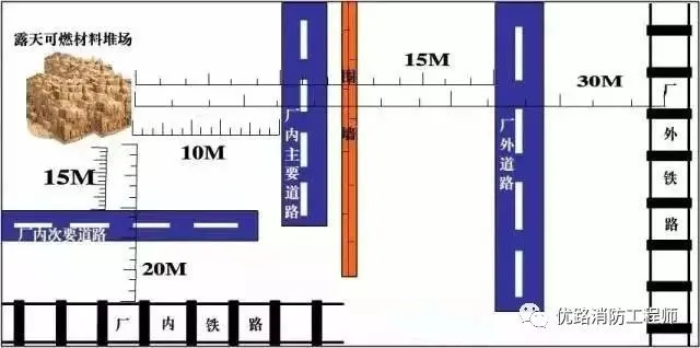 露天、半露天可燃材料堆場與廠外鐵路中心線、廠內鐵路中心線、廠外道路路邊、廠內主要道路路邊和廠內次要道路路邊的防火間距不應小于30、20、15、10和5米!督ㄖO計防火規(guī)范》(GB50016-2014)4.5.3