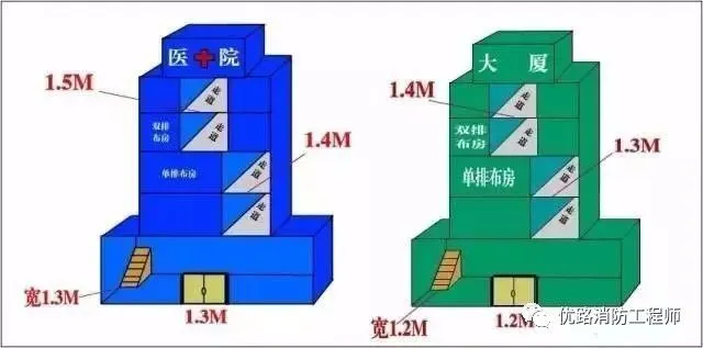 高層醫(yī)療建筑樓梯間的首層疏散門和首層疏散外門的寬度為1.3米,單排布房的走道寬1.4米,雙排布房的走道寬1.5米,疏散樓梯寬1.3米。其它高層建筑樓梯間的首層疏散門和首層疏散外門的寬度為1.2米,單排布房的走道寬1.3米,雙排布房的走道寬1.4米,疏散樓梯寬1.2米。 《建筑設計防火規(guī)范》(GB50016-2014)5.5.18