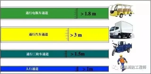 通行汽車,寬度>3 m;通行電瓶車,寬度>1.8 m;通行手推車、三輪車,寬度>1.5 m;一般人行通道,寬度>1 m。(未查到相關標準,但在注安考試教材中有明確說明)