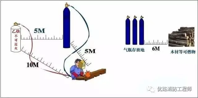 氣瓶在儲存時必須與可燃物、易燃液體隔離,并且遠離容易引燃的材料(諸如木材、紙張、包裝材料、油脂等)至少6 m 以上。《焊接與切割安全》(GB9448-1999)10.5.3