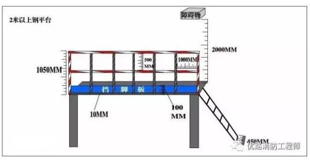 平臺地面到上方障礙物的垂直距離不應小于2000MM!豆潭ㄊ戒撎菁捌脚_安全要求第3部分:工業(yè)防護欄桿及鋼平臺》(GB4053.3-2009)6.2.1