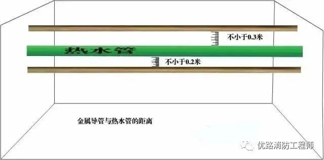 金屬導管和金屬槽盒敷設時,敷設在熱水管下方時,不宜小于 0.2m;在上方時,不宜小于0.3m;《低壓配電設計規(guī)范》(GB50054-2011)7.2.11