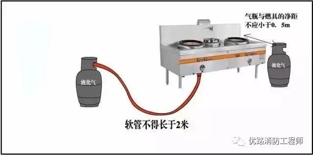 氣瓶與燃具的凈距不應小于0.5m!冻 鎮(zhèn) 燃 氣 設 計 規(guī) 范》(GB50028-2006)8.7.2