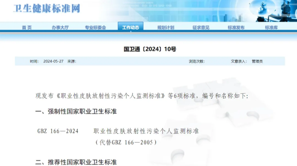 現(xiàn)發(fā)布《職業(yè)性皮膚放射性污染個(gè)人監(jiān)測(cè)標(biāo)準(zhǔn)》等6項(xiàng)標(biāo)準(zhǔn),編號(hào)和名稱(chēng)如下: