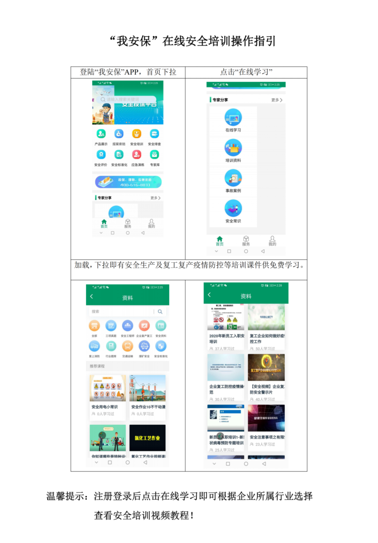 全國范圍新冠疫情已得到有效控制,各地都在緊張的組織企業(yè)復(fù)工復(fù)產(chǎn),安全生產(chǎn)是企業(yè)復(fù)工復(fù)產(chǎn)的重要保證,F(xiàn)階段,“我安保”APP線上培訓(xùn)所有資源均免費(fèi)向企業(yè)開放,主要是針對各行業(yè)領(lǐng)域的企業(yè)從業(yè)人員進(jìn)行安全生產(chǎn)教育線上培訓(xùn),江泰公司上傳培訓(xùn)視頻資源,還與專業(yè)的安全培訓(xùn)機(jī)構(gòu)合作,安全教育培訓(xùn)資源豐富,涉及的行業(yè)領(lǐng)域齊全,非常適合疫情當(dāng)下企業(yè)復(fù)工復(fù)產(chǎn)開展線上安全生產(chǎn)培訓(xùn)。